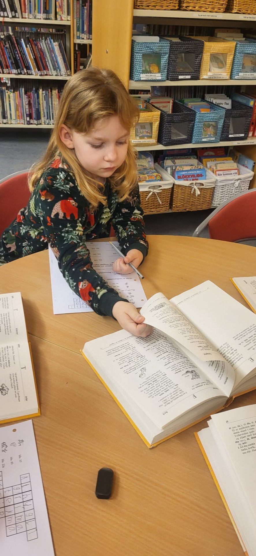 Eins og flestir vita þá eru bókasafnstímar í stundatöflum nemenda í 2. - 7. bekk. Verkefnin sem nemendur fást við í þessum tímum eru ansi fjölbreytt en öll til þess fallin að auka áhuga á bókalestri, styðja við gagnrýna hugsun, samvinnu og að leita lausna svo eitthvað sé nefnt. Þriðji bekkur var í bókasafnstíma hjá Birtu í dag þar sem nemendur voru að taka sín fyrstu skref í að nota orðabók og leita í henni.
