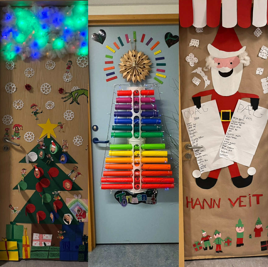 Fimmtudaginn 4. desember fór fram í fyrsta sinn keppni um flottustu jólahurðina hér í skólanum. Allir nemendur og starfsfólk í 1. - 10. bekk kepptust við að skreyta hurðir á stofum sínum. Það voru þó ekki einungis stofur umsjónabekkja sem tóku þátt heldur einnig list- og verkgreinakennarar sem og allir aðrir kennarar sem hafa afnot af skólastofu og/eða bókasafni. Hvert sem litið er innan skólans má sjá fallega skreytta jólahurð.