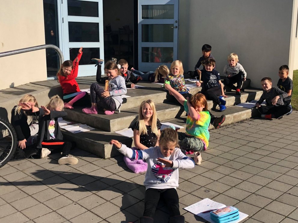 3. bekkur að læra stærðfræði úti í góða veðrinu